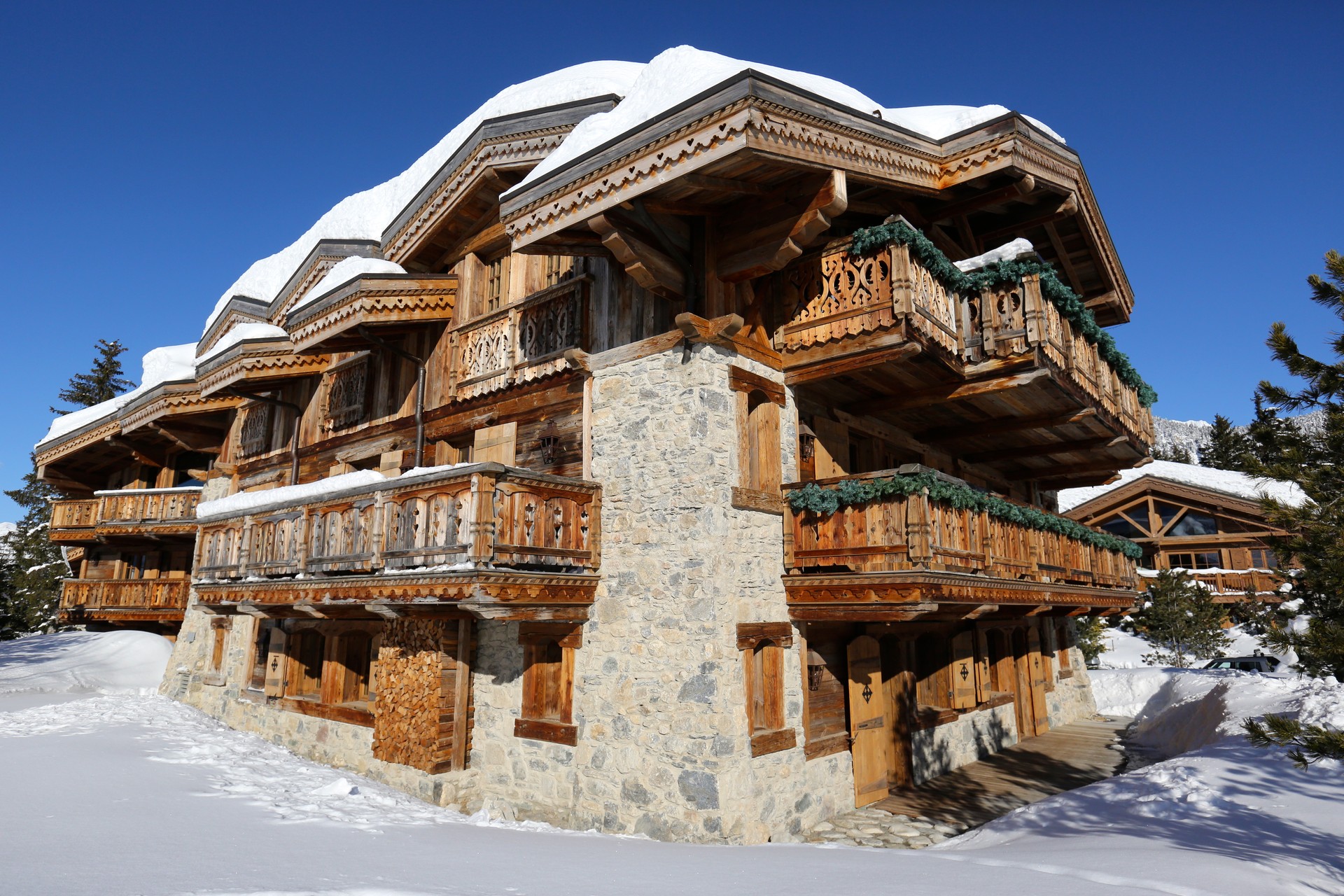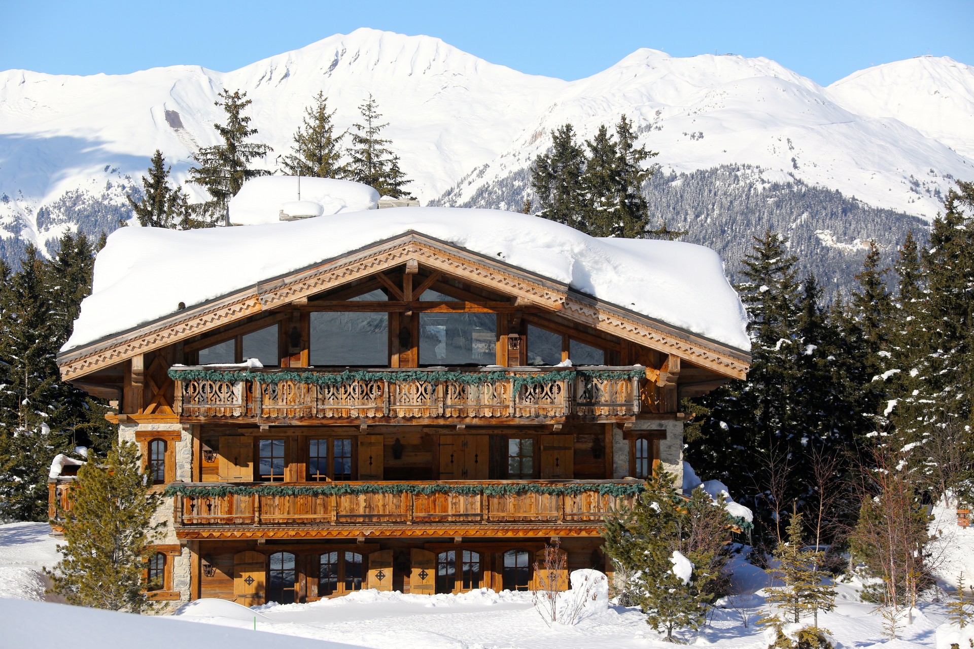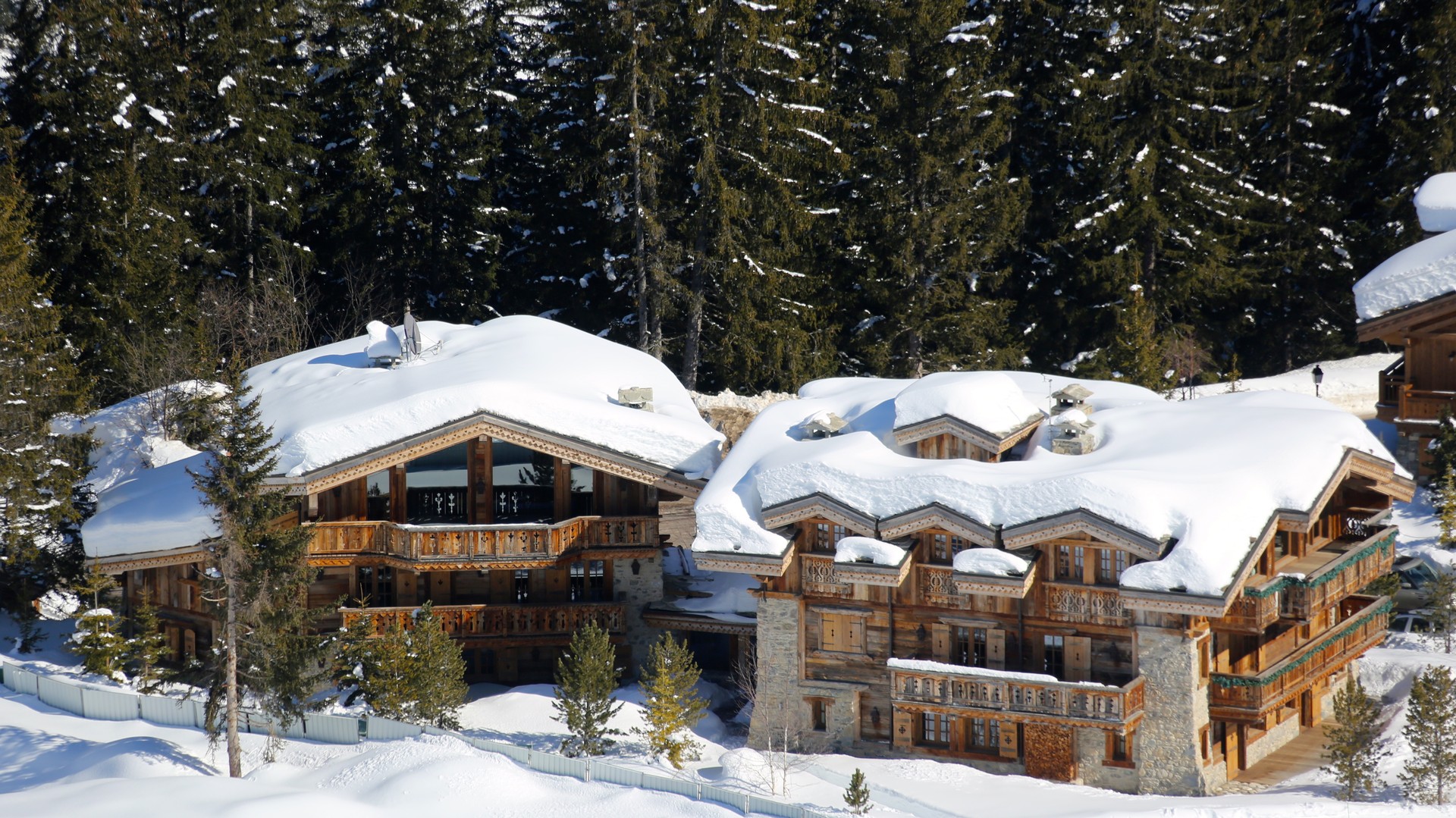 Situé sur l’emblématique piste de Bellecôte, ce domaine privé ne compte pas moins de six chalets reliés par une galerie souterraine !